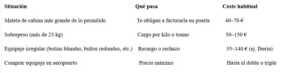 - Recargos especiales: sobrepeso, exceso de tamaño o equipaje irregular pueden suponer entre 35 y 140 euros adicionales.