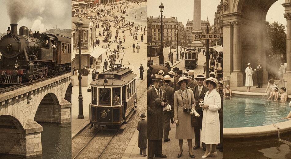El turismo de bienestar y salud también era muy popular. Ciudades como Baden-Baden en Alemania, Vichy en Francia o Montecatini en Italia ofrecían tratamientos termales y servicios de relax en entornos lujosos. Los visitantes podían mejorar su salud, descansar y disfrutar de comodidades de primer nivel, combinando bienestar físico con ocio y lujo, lo que reflejaba la creciente importancia del cuidado personal en la sociedad de la época.
