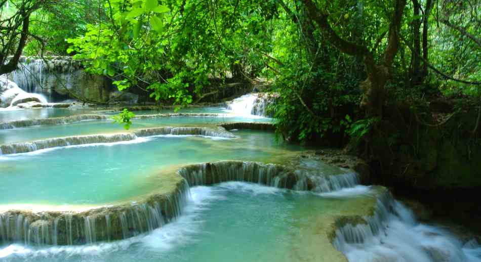 Siguiendo con el disfrute de la naturaleza pura de Laos, otra visita imprescindible es a las espectaculares y altas Cataratas Kuang Si, en los alrededores de Luang Prabang. Se trata de un conjunto de cascadas a distintas alturas y con balsas entre unas y otras con agua azul turquesa en medio de un denso bosque. En algunas de esas balsas está permitido el baño y saltar desde lianas al agua. La principal atracción es la gran catarata con una altura de cerca de 60 metros y con un pequeño mirador para apreciarla. Para disfrutarlas en toda su belleza hay que hacerlo fuera de la temporada de lluvias de mayo a octubre, debido a que la fuerza del agua remueve la tierra de fondo y enturbia el agua, además de que algunos senderos estarán impracticables con barro y no se podrá hacer la visita completa. Un poco antes de llegar a la gran catarata hay una zona con un pequeño restaurante y unos vestuarios y aseos donde poder cambiarse de ropa. Otra visita aconsejable es el centro de rescate y recuperación de osos negros asiáticos, una especie en peligro de extinción, y otros animales salvajes, Tat Kuang Si Rescue Centre, que está junto a la entrada a las cataratas. Desde aquí puede hacerse un recorrido de 25 kilómetros aguas arriba del Mekong hasta llegar a las cuevas de Pak Ou. Con más de 300 años de antigüedad, estos dos santuarios excavados en el interior de cuevas de piedra caliza, están ricamente decorados con miles de esculturas de Buda, la mayoría muy pequeñas dejadas ahí por los fieles.