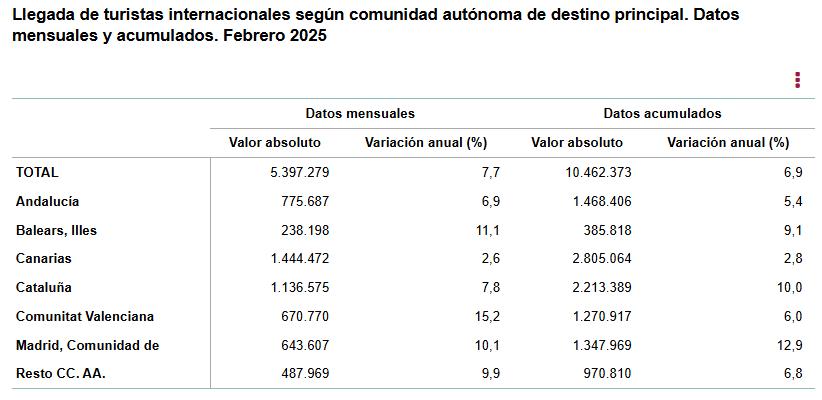 En el acumulado de los dos primeros meses de 2025 las comunidades que más turistas recibieron fueron Canarias (2,8 millones y un aumento del 2,8% respecto al mismo período de 2024), Cataluña (2,2 millones y un incremento del 10,0%) y Andalucía (1,5 millones, un 5,4% más).