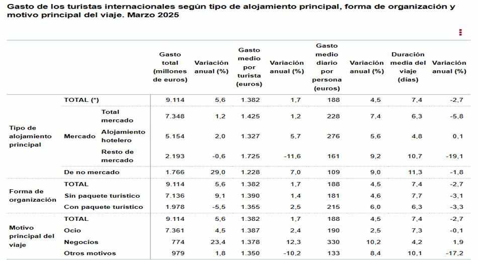 El gasto total realizado por los turistas internacionales que visitaron España en marzo alcanzó los 9.114 millones de euros, con un aumento del 5,6% respecto al mismo mes de 2024.