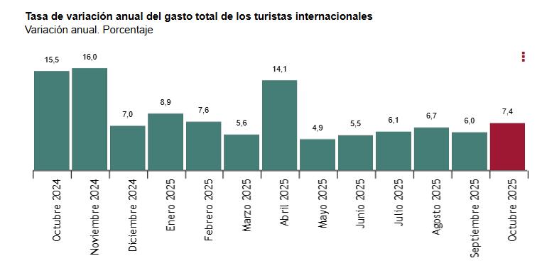 El gasto total realizado por los turistas internacionales que visitaron España en octubre alcanzó los 12.785 millones de euros, con un aumento del 7,4% respecto al mismo mes de 2024.