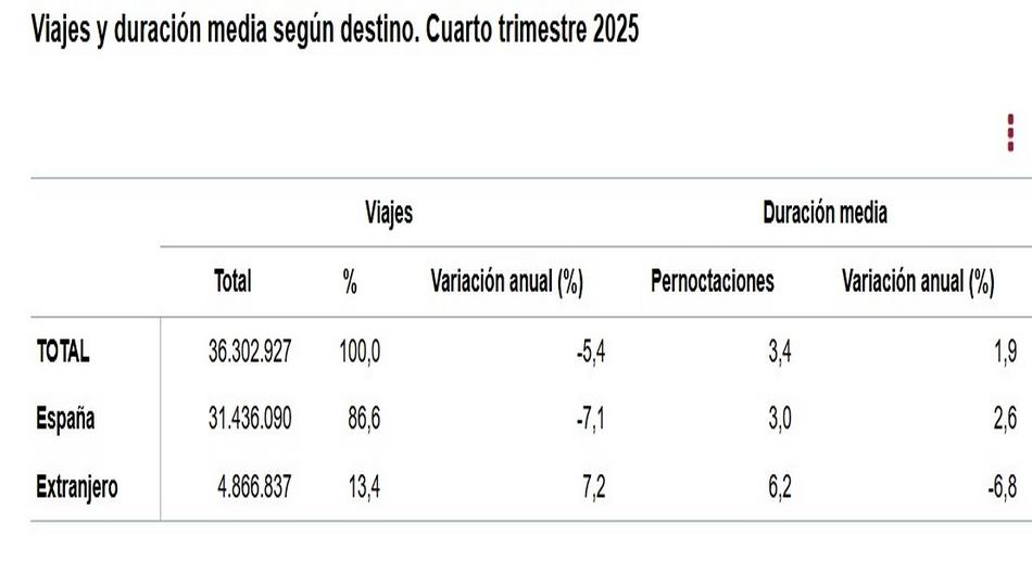 El gasto total de los viajes del cuarto trimestre fue de 12.461,3 millones de euros, con un aumento del 2,5% respecto al mismo periodo de 2024. En los viajes con destino nacional el gasto total subió un 0,2% y en los realizados al extranjero un 6,3%.