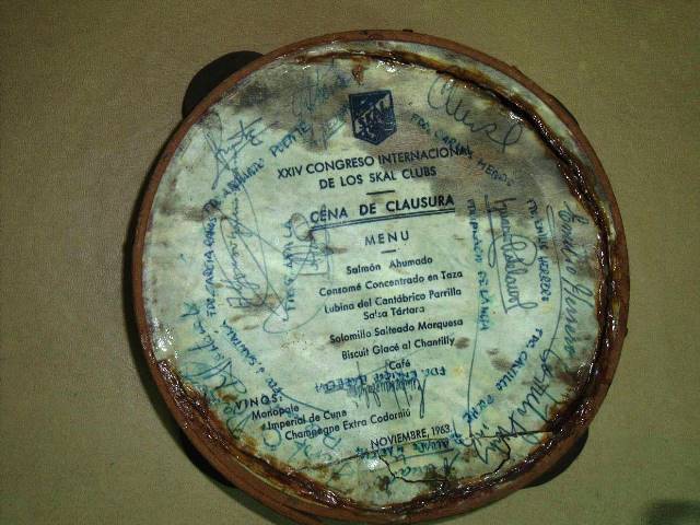 Menú de la cena de clausura del XXIV Congreso de la Asociación Mundial Skal Club, impreso en una pandereta española, que se entregó a cada uno de los asistentes a tan celebrado acontecimiento en el año 1963, en Santa Cruz de Tenerife.