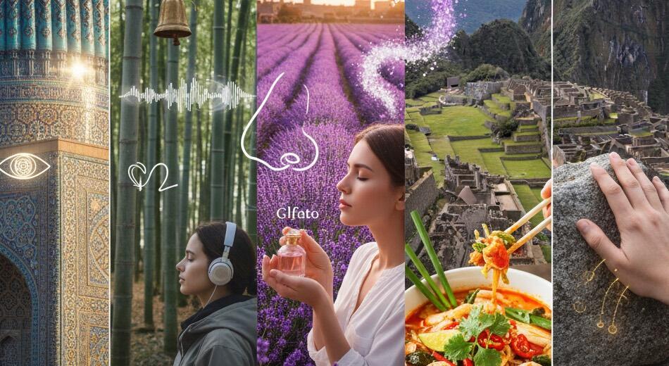 Los viajes sensoriales permiten:Oír sonidos locales auténticos: cantos tradicionales, mercados vibrantes, ríos y bosques.Oler aromas que definen el lugar: hierbas, flores, especias, brisa marina o tierra mojada.Tocar materiales y texturas propias de la cultura: tejidos, cerámica, madera o arena.Probar sabores locales: desde platos tradicionales hasta ingredientes únicos de cada región.Ver el entorno desde perspectivas inmersivas, a menudo acompañadas de luz, color y movimientos.Cada sentido se convierte en una puerta hacia una conexión más profunda con el destino.