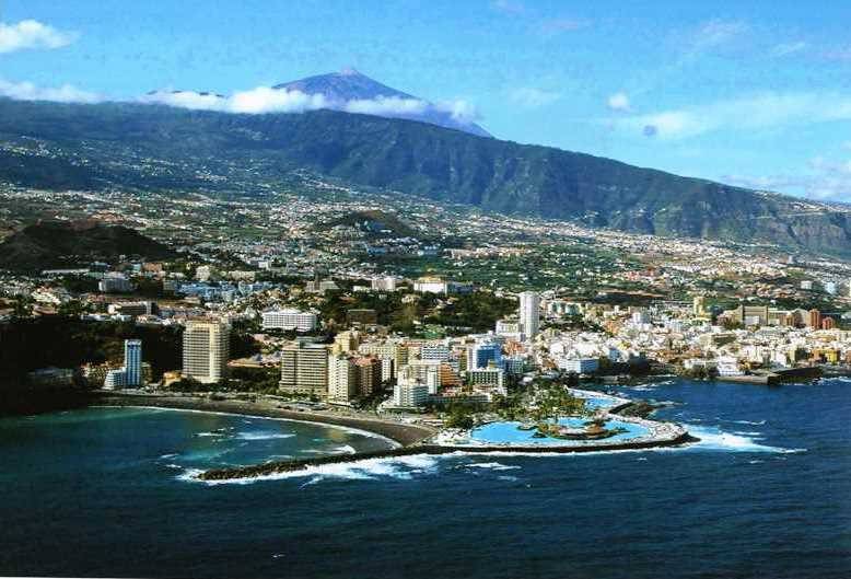 Impresionante fotografía de Puerto de la Cruz, Tenerife, con el Volcán Teide al fondo, y el Valle de la Orotava, lugar donde nació el turismo de élite en las Islas Canarias – principios del Siglo XX – hoy de obligada visita para el turista que llega a la isla gracias al mundialmente famoso Loro Parque (parque de atracción temático número uno del mundo, según TripAdvisor).